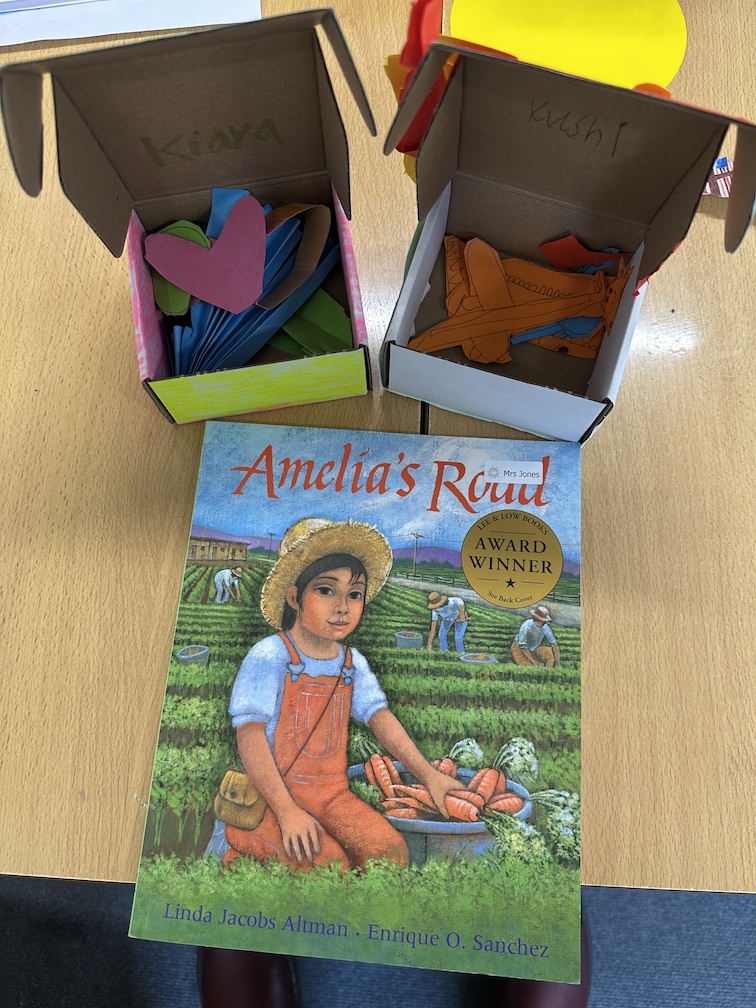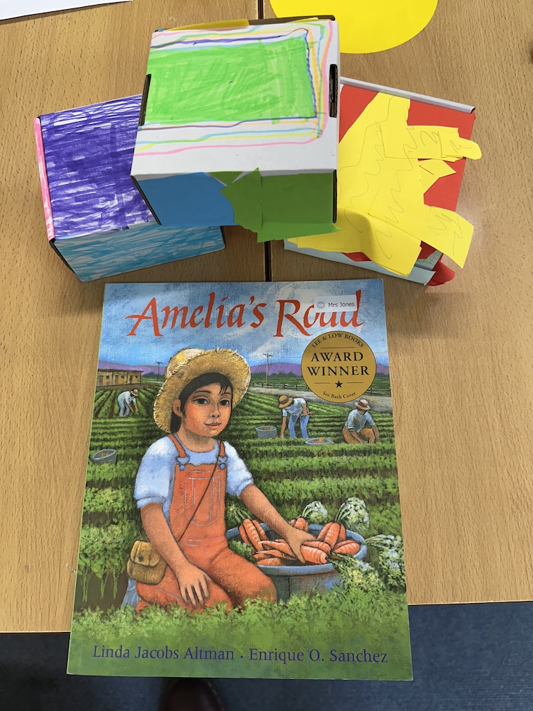 We read a book called ‘Amelia’s road’ which is about a little girl whose family always travelled to pick harvests. She buried a box of special things under a tree in a place where she wanted to belong. We made our own boxes of special things we love.